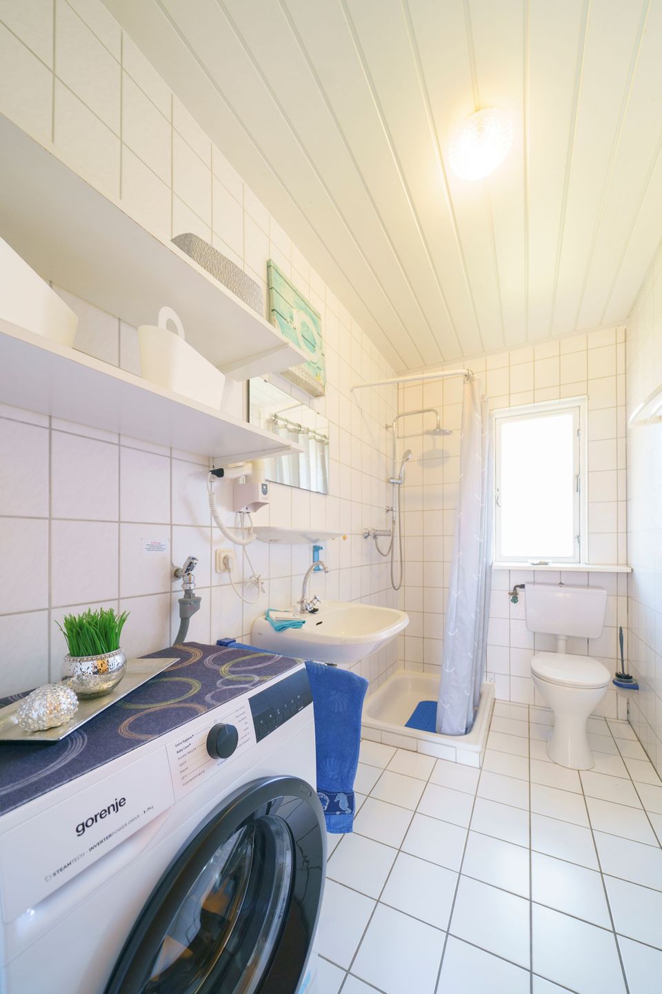 Das Ferienhaus verfügt außerdem über ein Badezimmer mit Dusche, WC und Waschmaschine. Ergänzt wird die Ausstattung durch praktische Annehmlichkeiten wie Haartrockner, Staubsauger, Bügeleisen, Bügelbrett und Wäscheständer. Für ein angenehmes Wohnklima sorgen Heizung und Fußbodenheizung. WLAN ermöglicht es Ihnen, auch im Urlaub online zu bleiben, während Rauchmelder für zusätzliche Sicherheit sorgen. Auf dem Grundstück stehen Ihnen zudem zwei kostenfreie Privatparkplätze zur Verfügung.