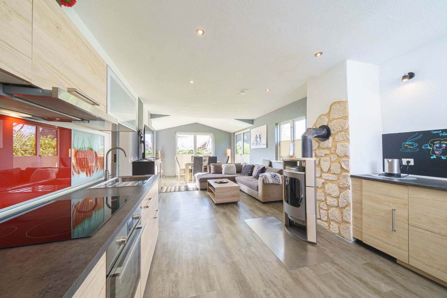 Im Inneren erwartet Sie ein gemütlicher Wohnbereich mit Sofaecke und Essplatz, der zum gemeinsamen Verweilen einlädt. Für Unterhaltung sorgen ein Fernseher mit Satellitenanschluss sowie ein Radio und CD-Spieler. Die voll ausgestattete Küche lässt keine Wünsche offen: Mit Herd, Backofen, Mikrowelle, Spülmaschine, Kühlschrank sowie Kaffeemaschine, Wasserkocher und Toaster können Sie Ihre Mahlzeiten ganz bequem selbst zubereiten. Geschirr und Besteck sind selbstverständlich vorhanden.